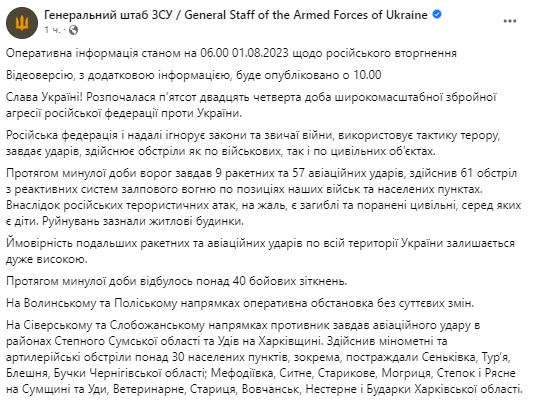 Генштаб ВСУ утром 1 августа обнародовал сводку о ситуации на фронте.