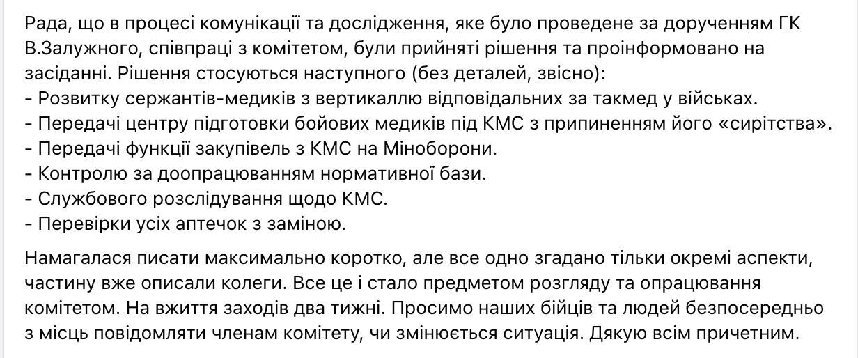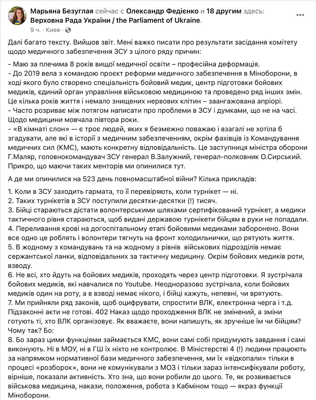 Народный депутат от фракции "Слуга народа" Марьяна Безуглая пишет о проблемах с медициной в армии по результатам заседания профильного комитета.