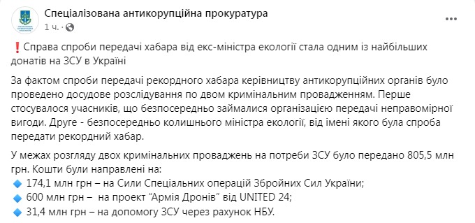 Дело попытки передачи взятки экс-министром экологии стало одним из самых больших донатов на ВСУ в Украине. В рамках рассмотрения двух уголовных производств на нужды ВСУ было передано 805,5 млн грн. Средства были направлены на: