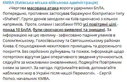 Ночью РФ в очередной раз атаковала Киев беспилотниками. Предварительно, это были дроны типа "Шахед".
