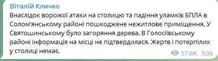 Зафиксировано падение обломков в Соломенском, Голосеевском и Святошинском районах Киева. Имеются повреждения нежилых помещений и дорожного покрытия. Обошлось без серьезных разрушений и пожаров. Информация о пострадавших отсутствует.