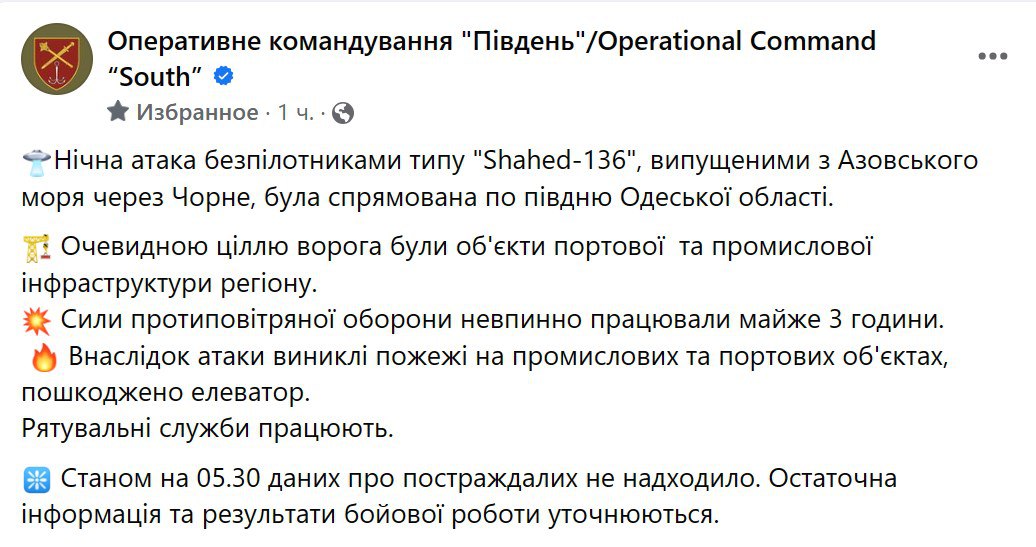 "Силы противовоздушной обороны работали почти три часа. В результате атаки возникли пожары на промышленных и портовых объектах, поврежден элеватор", - заявляют военные.
