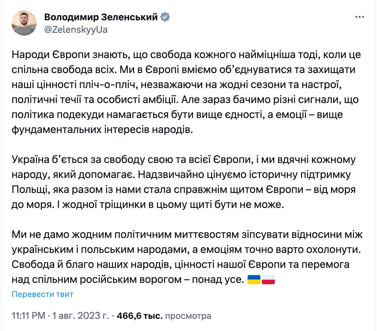 "Мы не дадим никаким политическим мгновениям испортить отношения между украинским и польским народами, а эмоциям точно стоит остыть. Свобода и благо наших народов, ценности нашей Европы и победа над общим российским врагом – превыше всего", - написал президент.