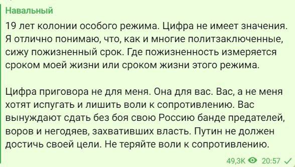 "19 лет колонии особого режима. Цифра не имеет значения. Я отлично понимаю, что, как и многие политзаключенные, сижу пожизненный срок. Где пожизненность измеряется сроком моей жизни или сроком жизни этого режима. Цифра приговора не для меня. Она для вас. Вас, а не меня хотят испугать и лишить воли к сопротивлению. Вас вынуждают сдать без боя свою Россию банде предателей, воров и негодяев, захвативших власть. Путин не должен достичь своей цели. Не теряйте воли к сопротивлению", – написал Навальный.
