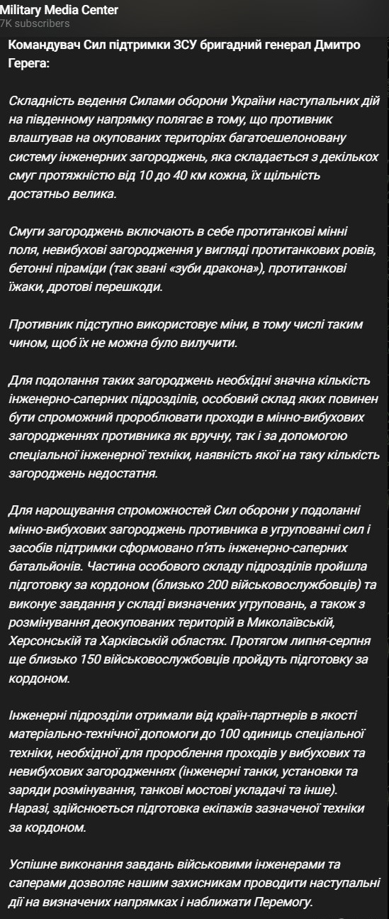 Командующий Силами поддержки Вооруженных Сил Украины Дмитрий Герега объяснил, в чем сложности с преодолением российской обороны на юге.
