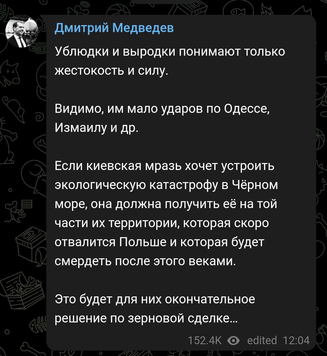 Заместитель председателя Совета безопасности РФ Дмитрий Медведев после атаки на российский танкер около Керченского пролива выступил с традиционным заявлением с угрозами "ответного удара" по Украине.