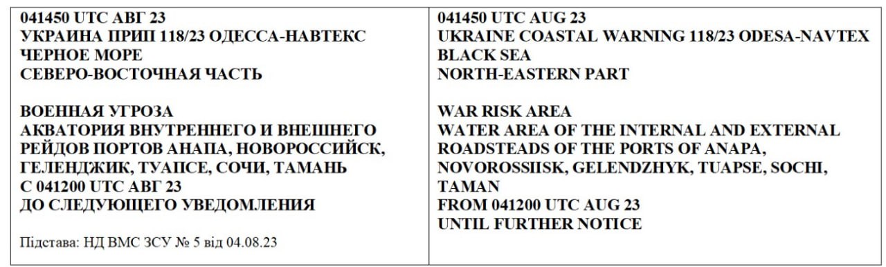 "Черное море. Северо-восточная часть. Военная угроза. Акватория внутреннего и внешнего рейдов портов Анапа, Новороссийск, Геленджик, Туапсе, Сочи, Тамань", – говорится в предупреждении.