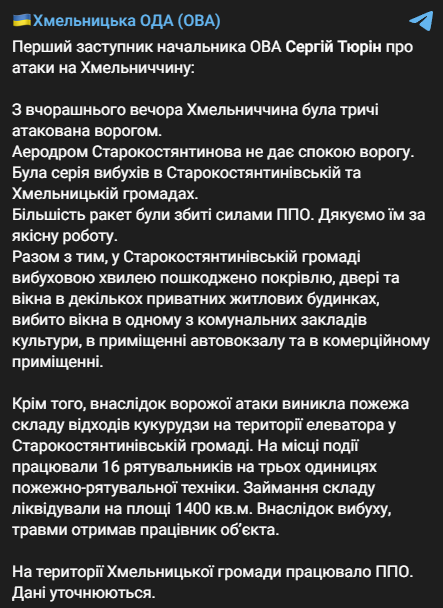 Со вчерашнего вечера Хмельницкая область была трижды атакована российскими войсками. Была серия взрывов в Староконстантиновской и Хмельницкой общинах. Большинство ракет были сбиты силами ПВО.