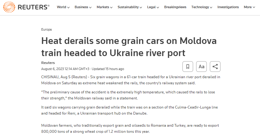 В Молдове из-за аномальной жары сошли с рельсов 6 вагонов с зерном, которые направлялись в украинский порт Рени на реке Дунай.