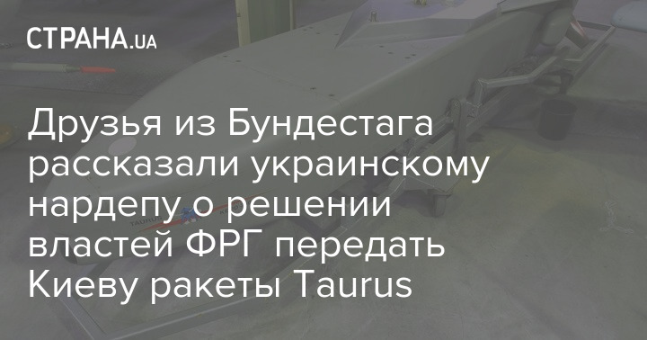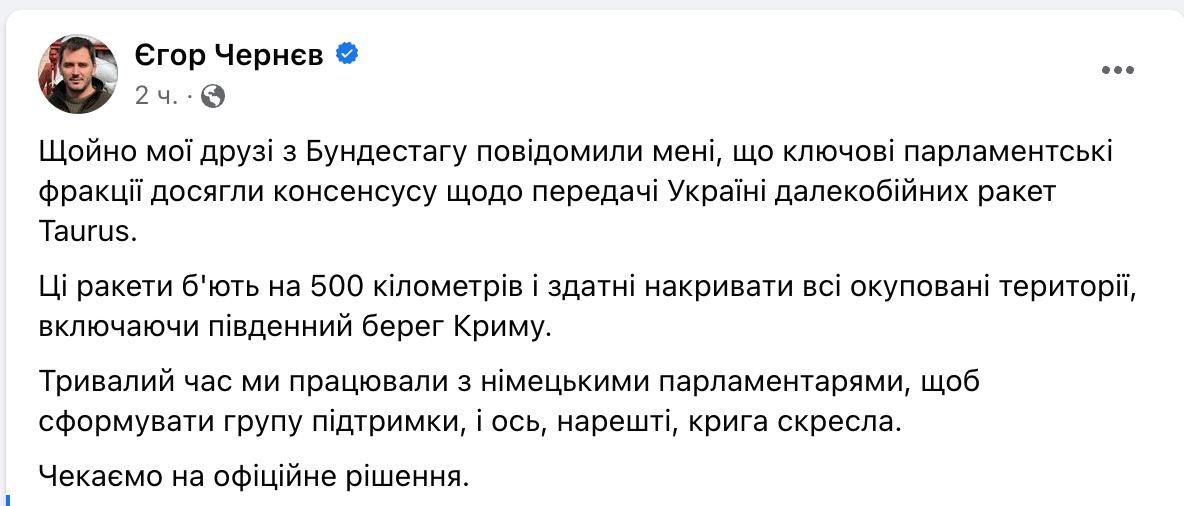 "Только что мои друзья из Бундестага сообщили мне, что ключевые парламентские фракции достигли консенсуса относительно передачи Украине дальнобойных ракет Taurus. Эти ракеты бьют на 500 км и способны накрывать все оккупированные территории, включая южный берег Крыма. Долгое время мы работали с немецкими парламентариями, чтобы сформировать группу поддержки, и вот, наконец, лед тронулся. Ждем официального решения", - сказано в посте депутата.