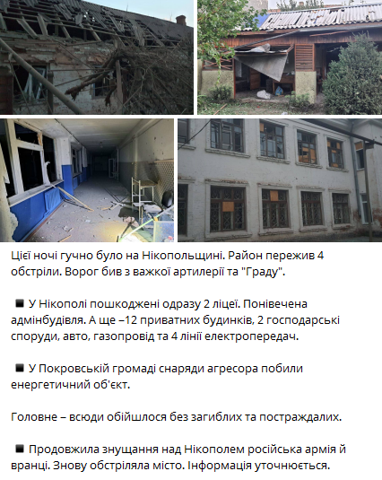 В Никополе повреждены сразу два лицея, изуродовано админздание, а еще –12 частных домов, две хозяйственные постройки, авто, газопровод и четыре линии электропередач.