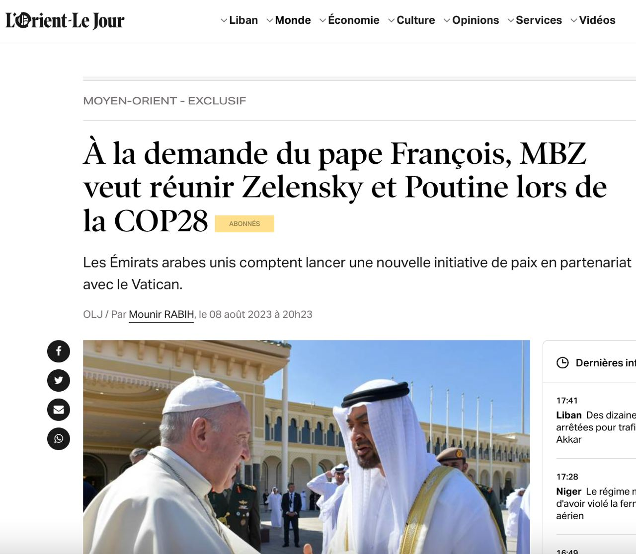 Президент Объединенных Арабских Эмиратов Мухаммад бин Заид намерен организовать встречу президента Украины Владимира Зеленского и Владимира Путина в рамках предстоящей конференции ООН по изменению климата COP28.