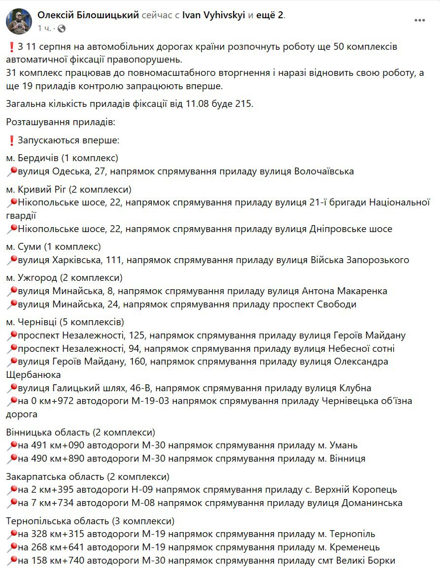 Полный список локаций, где с 11 августа возобновится видеофиксация - на скриншоте.