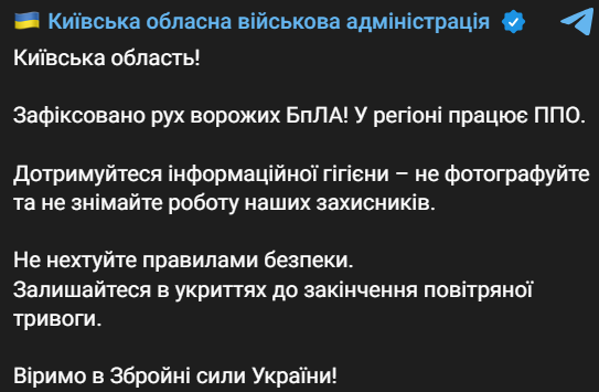 "Зафиксировано движение вражеских БПЛА! В регионе работает ПВО", - говорится в сообщении.