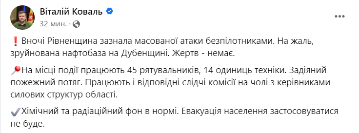 "Ночью Ровенщина подверглась массированной атаке беспилотниками. К сожалению, разрушена нефтебаза в Дубенщине. Жертв – нет", - написал Коваль.