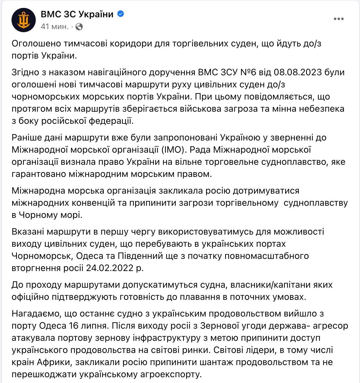 12:20 Военно-морские Силы Украины объявили временные коридоры для торговых судов, идущих в/из украинских портов на Черном море.