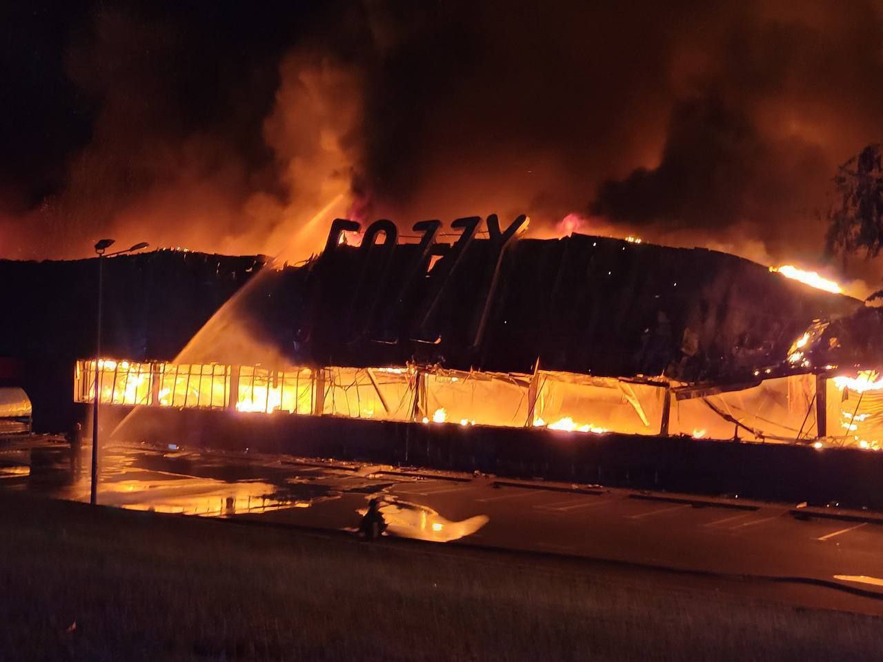 На кадрах видно, что сгорел супермаркет "Фоззи".