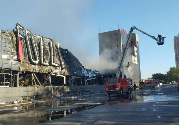 Полностью выгорел гипермаркет "Фоззи", на который упали обломки сбитых ракет.