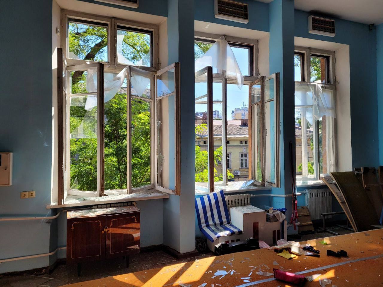 10.54 В Одессе в результате падения обломков и взрывных волн пострадали по меньшей мере 113 зданий, в том числе 7 учебных заведений и памятник архитектуры.