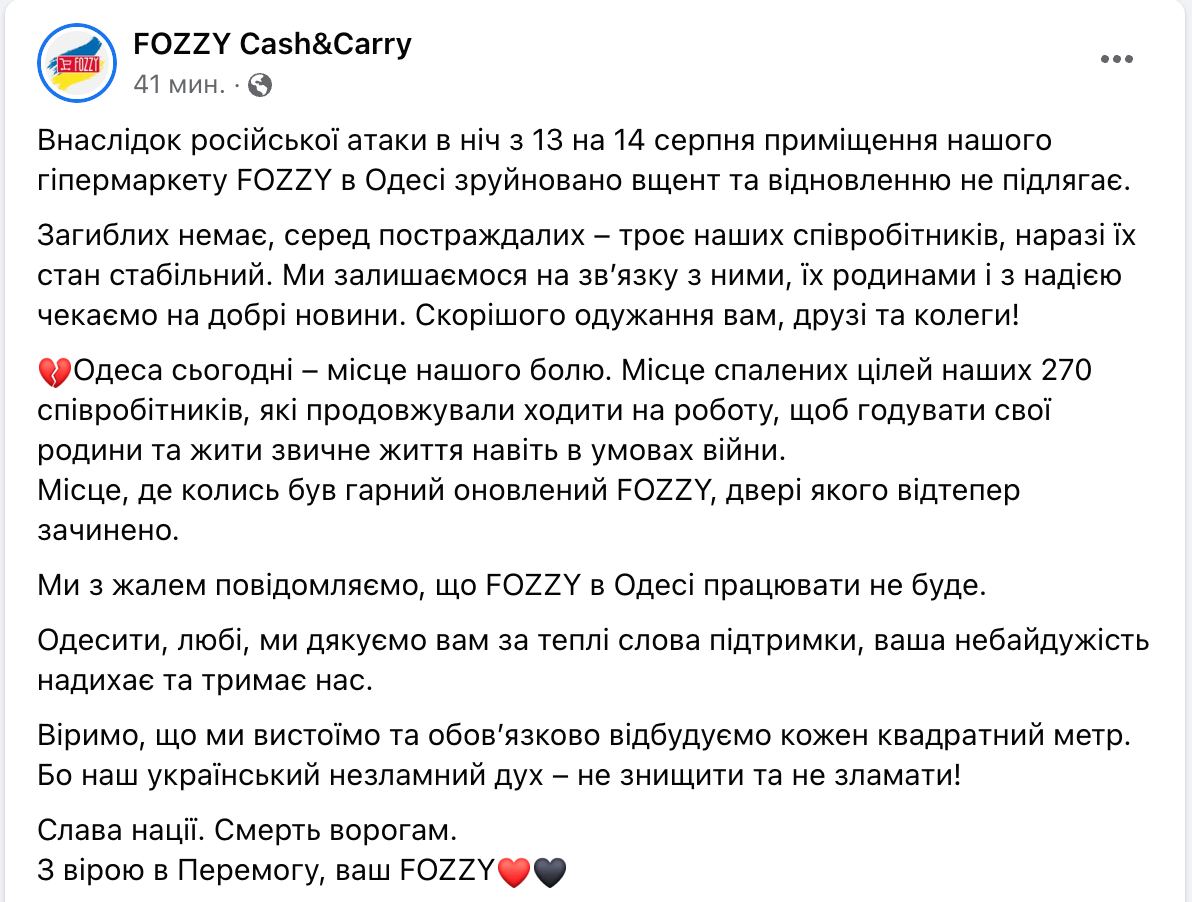 13.55 Сеть супермаркетов FOZZY заявляет о прекращении работы в Одессе.