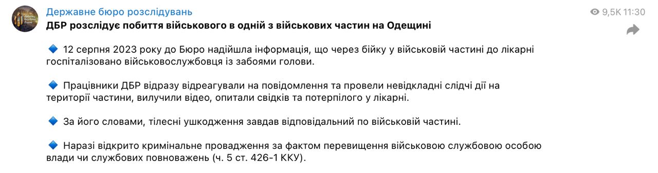 14.09 В одной из воинских частей Одесской области избили военнослужащего, сообщает ГБР.