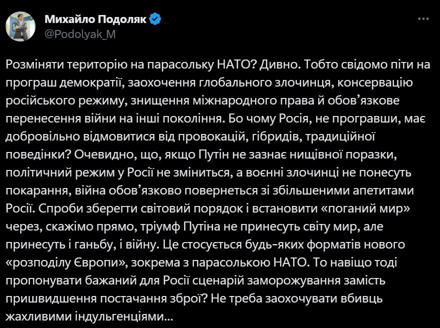 "Разменять ли территорию на зонтик НАТО? Удивительно. То есть сознательно пойти на проигрыш демократии, поощрение глобального преступника, консервацию российского режима, уничтожение международного права и обязательный перенос войны на другие поколения. Попытки сохранить мировой порядок и установить "плохой мир" из-за, скажем прямо, триумфа Путина, не принесут миру мир, но принесут и позор, и войну. Это касается любых форматов нового "разделения Европы", в том числе с зонтиком НАТО", – написал в Твиттере советник президента Украины.