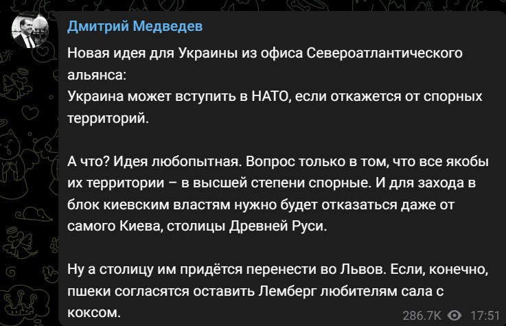 "Идея любопытная. Вопрос только в том, что все их (Украины - Ред.) территории – в высшей степени спорные. И для захода в блок киевским властям нужно будет отказаться даже от самого Киева, столицы Древней Руси. Ну а столицу им придётся перенести во Львов", – написал Медведев в Твиттере.
