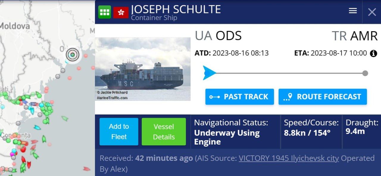 Контейнеровоз "JOSEPH SCHULTE" под флагом Гонконга, который находился в одесском порту с 23 февраля прошлого года, вышел за Воронцовский маяк и держит курс на Босфор. На борту – более 30 тыс. тонн груза (2 114 контейнеров), в том числе с продовольствием.