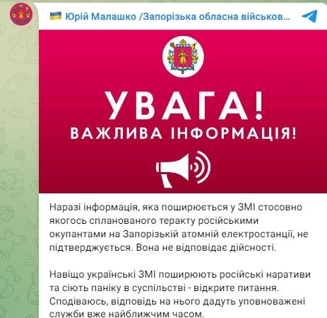 "На данный момент информация, которая распространяется в СМИ относительно какого-либо спланированного теракта российскими оккупантами на Запорожской атомной электростанции, не подтверждается. Она не соответствует действительности", - сообщил он.
