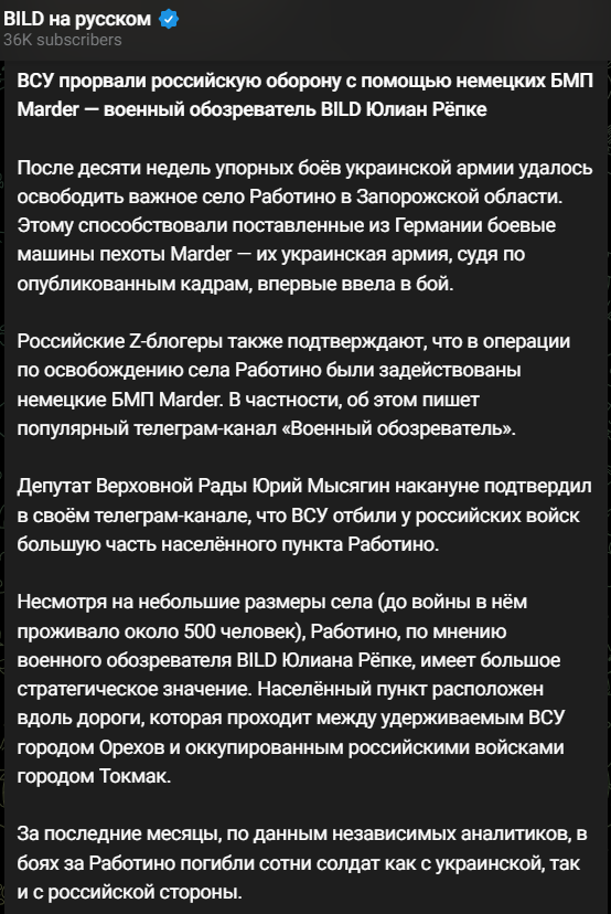 ВСУ освободили село Работино на ореховском направлении под Запорожьем. Сделать это удалось с помощью немецких БМП Marder. Судя по опубликованным видео, Украина впервые ввела их в бой.