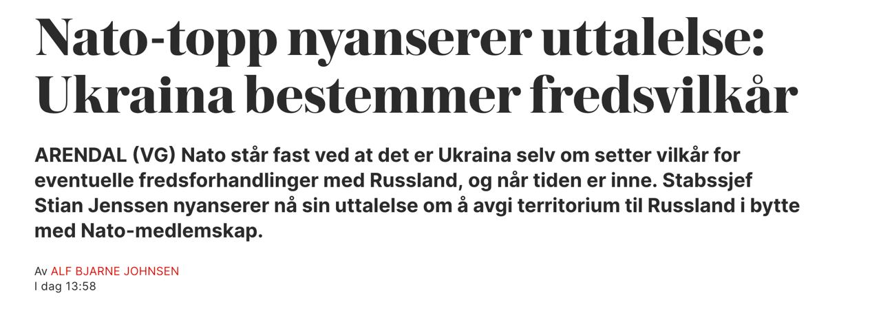 Глава канцелярии генерального секретаря НАТО Стиан Йенсен назвал ошибкой свое заявление о том, что Украина может получить членство в НАТО в обмен на уступку части территории РФ.