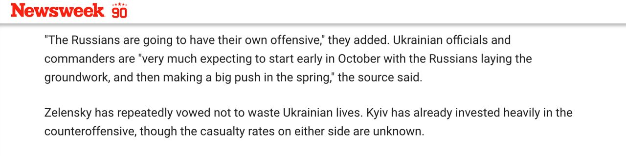 Издание пишет, что украинские власти и командиры "с очень большой вероятностью ожидают, что россияне начнут подготовку в начале октября, чтобы затем весной совершить большой рывок".
