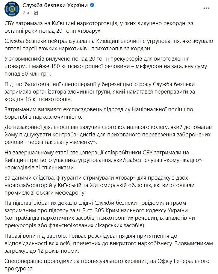 Во время обысков был изъят рекордный за последние годы объем товара - более 20 тонн прекурсоров для изготовления наркотиков и почти 150 кг готового мефедрона на общую сумму более 30 млн грн.