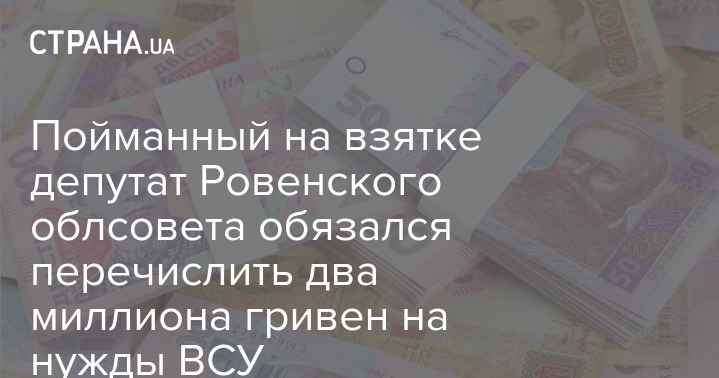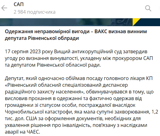 Высший антикоррупционный суд (ВАКС) признал виновным в получении неправомерной выгоды депутата Ровенского областного совета, получившего взятку за оформление инвалидности пострадавшей вследствие аварии на ЧАЭС. Осужденный обязался перечислить на нужды ВСУ два миллиона гривен.