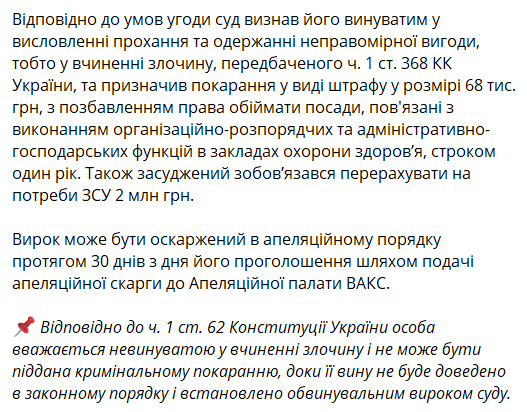 Суд признал депутата виновным в совершении преступления, предусмотренного ч. 1 ст. 368 Уголовного кодекса Украины и назначил наказание в виде штрафа в размере 68 тысяч грн с лишением права занимать должности, связанные с выполнением организационно-распорядительных и административно-хозяйственных функций в учреждениях здравоохранения, сроком один год.