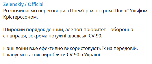 "Широкая повестка дня, но топ-приоритет – оборонное сотрудничество, в том числе мощные шведские CV-90 (БМП, на фото - Ред.). Наши воины уже эффективно используют их на передовой. Планируем также производить CV-90 в Украине", - заявил Зеленский.