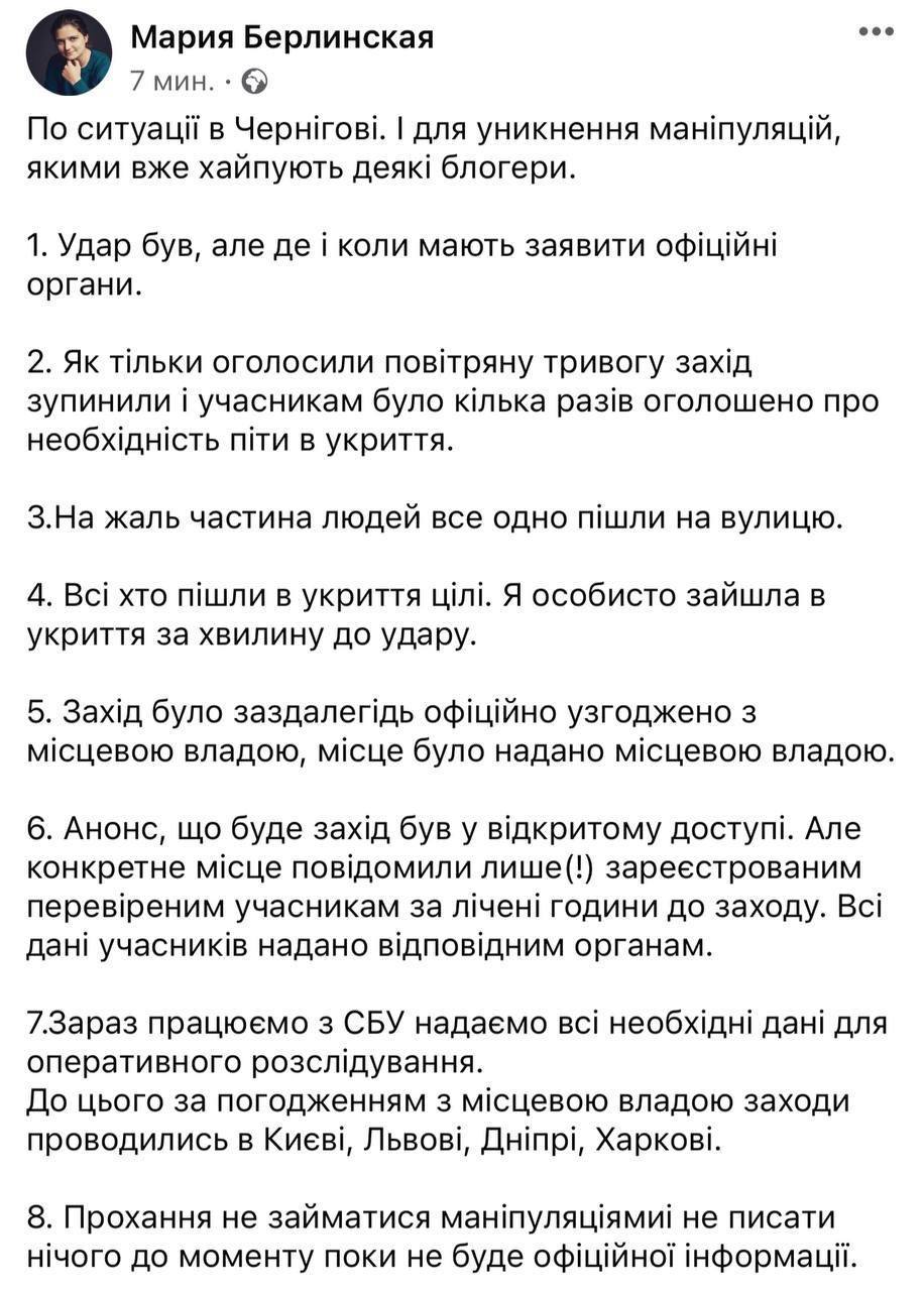 Известный волонтер Мария Берлинская, организатор выставки дронов в драмтеатре Чернигова, которая была целью российского удара, дала комментарий о случившемся обстреле со стороны РФ.