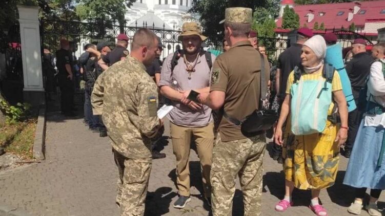 К полицейским, выстроившим оцепление возле Почаевской лавры, присоединились военкомы, которые вручали повестки мужчинам, принявшим участие в крестном ходе.