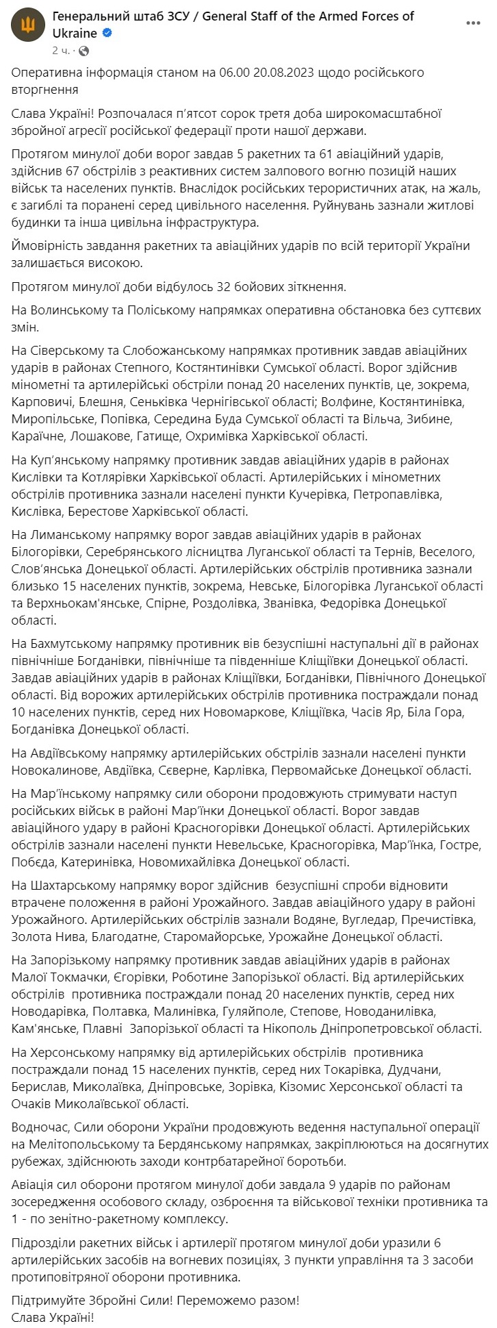За прошедшие сутки россияне нанесли 5 ракетных и 61 авиационный удар, совершили 67 обстрелов из реактивных систем залпового огня по позициям наших войск и населенным пунктам. В течение минувших суток произошло 32 боевых столкновения.