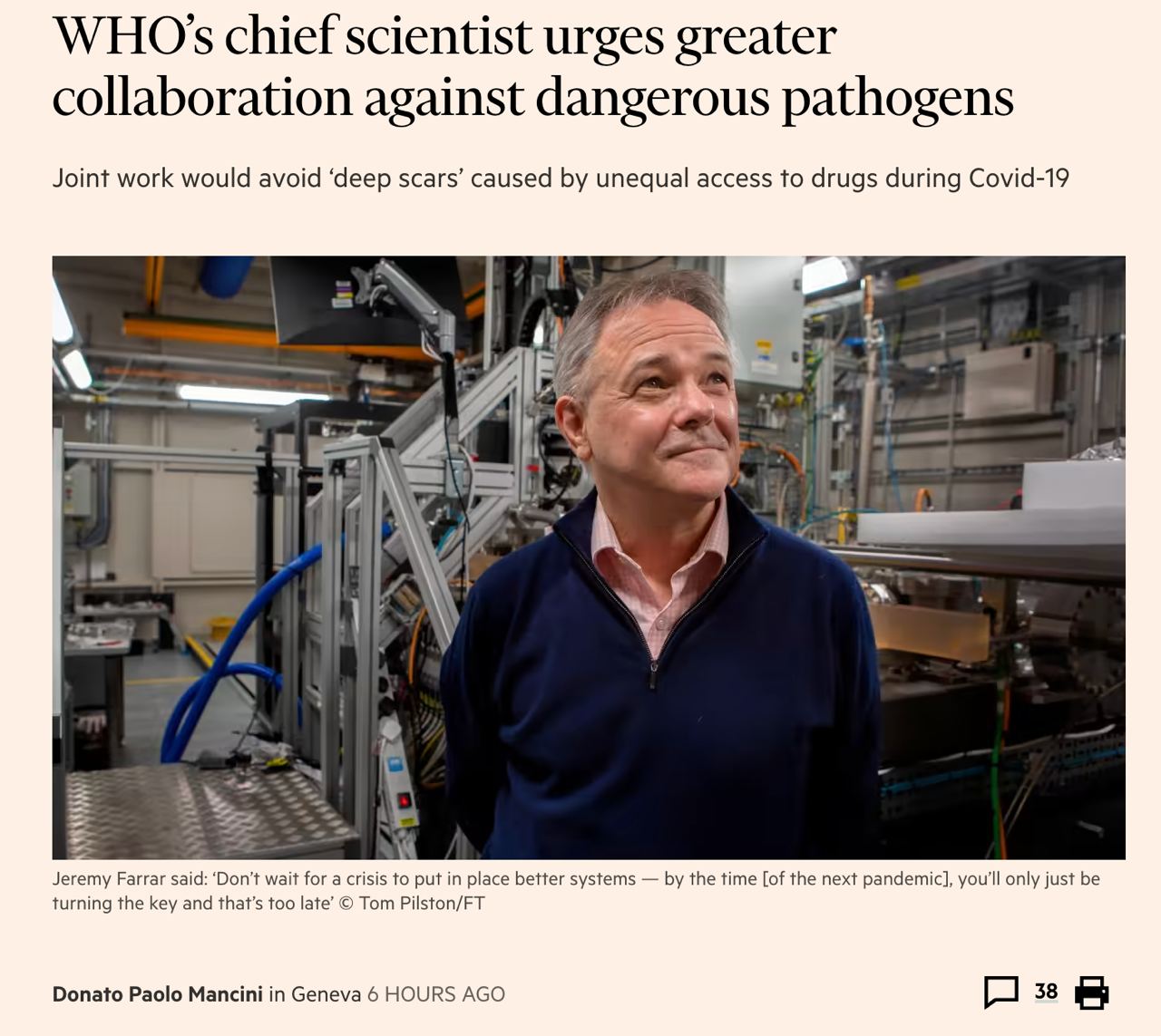 Фаррар поддержал организацию новой миссии ВОЗ в Китай, но только если Пекин проявит "готовность поделиться всей информацией".