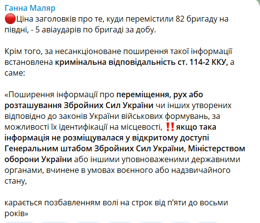 "Цена заголовков о том, куда переместили 82 бригаду на юге, - 5 авиаударов по бригаде в сутки", - написала она.