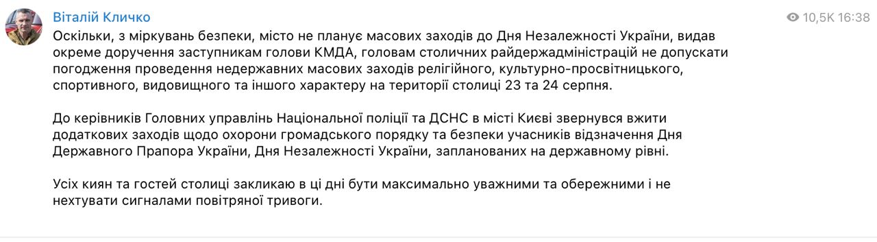 В Киеве на День Независимости не будет официальных мероприятий, а также запретят другие негосударственные массовые мероприятия.