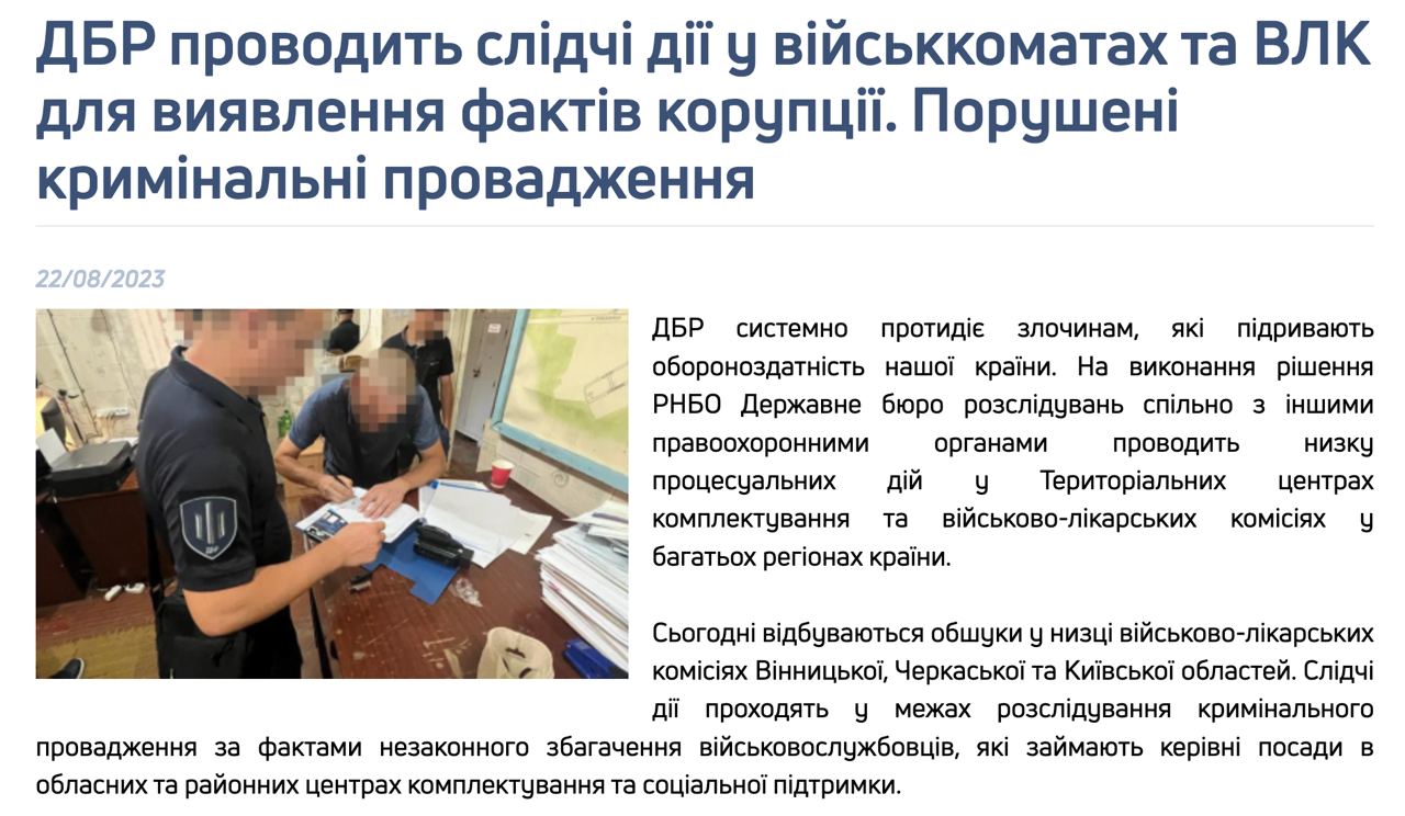 Государственное бюро расследований проводит массовые обыски в военкоматах и военно-врачебных комиссиях в Винницкой, Черкасской и Киевской областях.