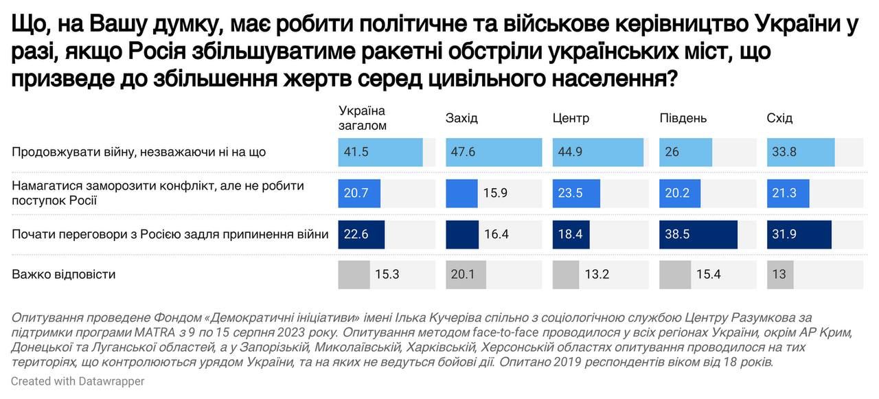 Как показал опрос, 20,7% респондентов предпочли бы попытаться в случае продолжения обстрелов заморозить конфликт, но не идти на уступки России. 22,6% опрошенных считают, что в такой ситуации нужно начать переговоры с РФ о прекращении войны (в сумме 43,3%).