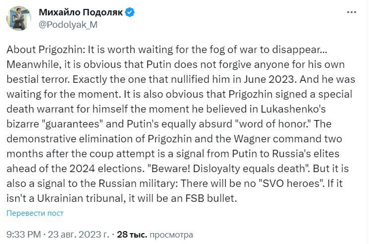 "Демонстративное устранение Пригожина и команды Вагнера через два месяца после попытки государственного переворота является сигналом Путина российским элитам в преддверии выборов 2024 года. "Осторожно! Нелояльность равна смерти", — считает Подоляк.