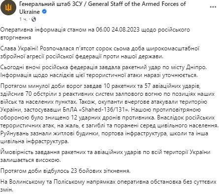 Утром 24 августа Генштаб ВСУ обнародовал сводку о ситуации на фронте.