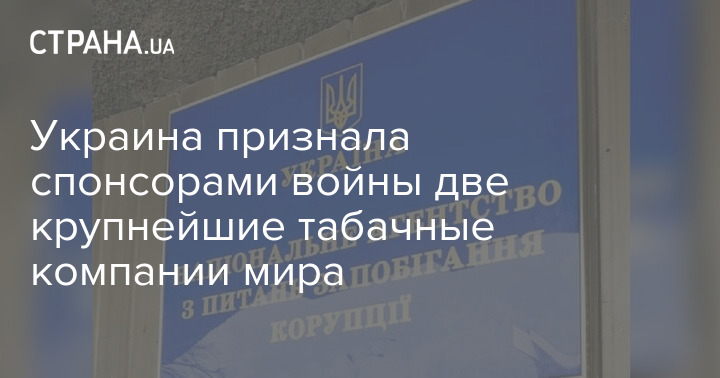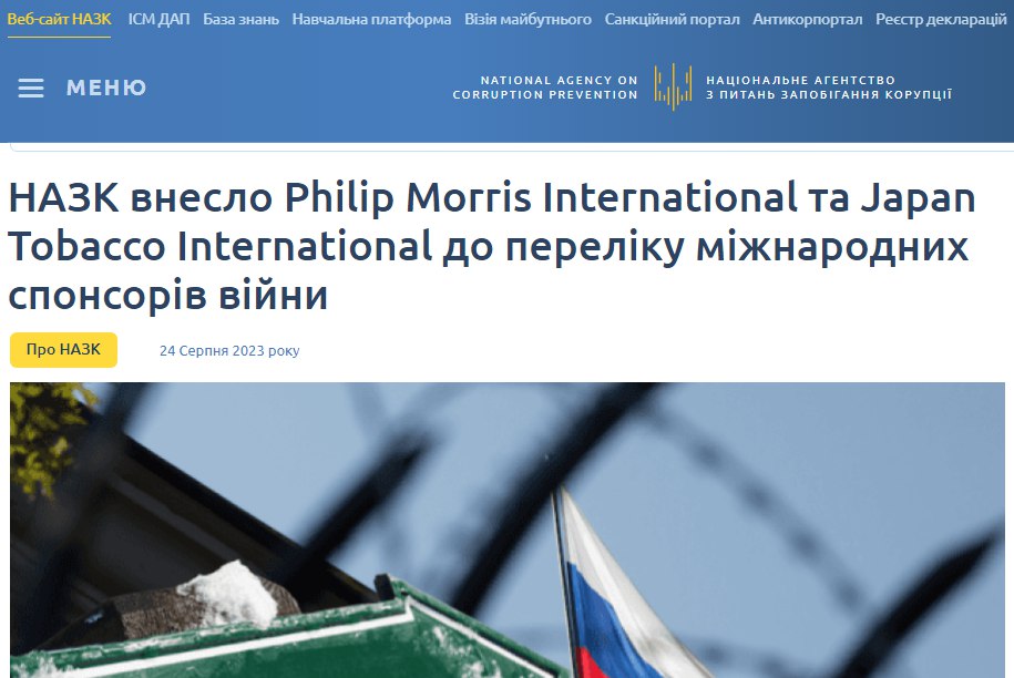 Национальное агентство по предотвращению коррупции (НАПК) внесло в список международных спонсоров войны две крупнейшие табачные компании мира: Philip Morris International и Japan Tobacco International. Это связано с тем, что компании продолжают вести бизнес в России и платят значительные суммы налогов в тамошний бюджет.