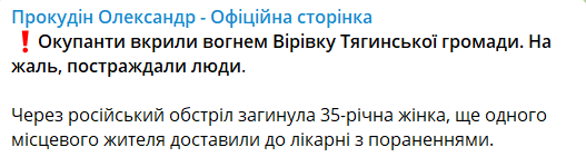 "Из-за российских обстрелов погибла 35-летняя женщина, еще одного местного жителя доставили в больницу с ранениями", - написал Прокудин.