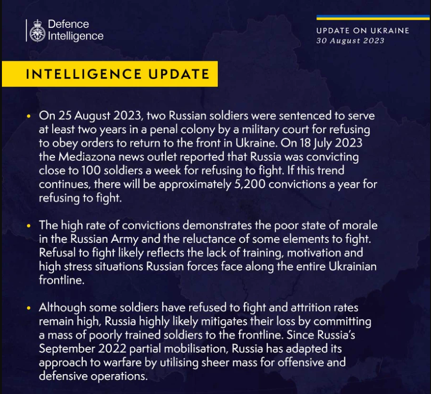 Сообщается, что 25 августа 2023 года военный суд приговорил двух российских солдат к лишению свободы на срок не менее двух лет колонии за отказ подчиниться приказу вернуться на фронт в Украине.