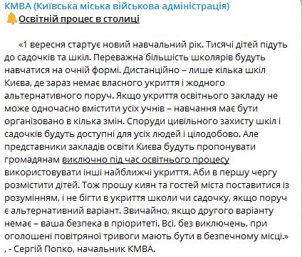"Так что прошу киевлян и гостей города отнестись с пониманием, и не бежать в укрытие школы или садика, если рядом есть альтернативный вариант. Конечно, если второго варианта нет – ваша безопасность в приоритете. Все, без исключений, при объявлении воздушной тревоги должно быть в безопасном месте", –сообщил  Сергей Попко, начальник КГВА.